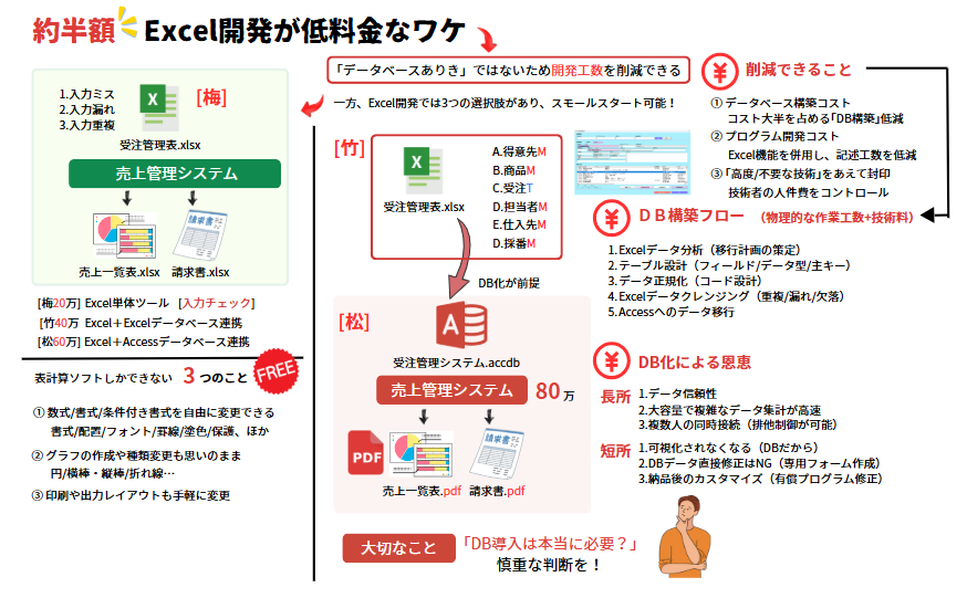 - 維持コスト(メンテナンス) Excelと違って、データは可視化されなくなります。また、DB導入後は、小さな改修もプログラム修正が伴うため「システム会社への依存度」が高まります。